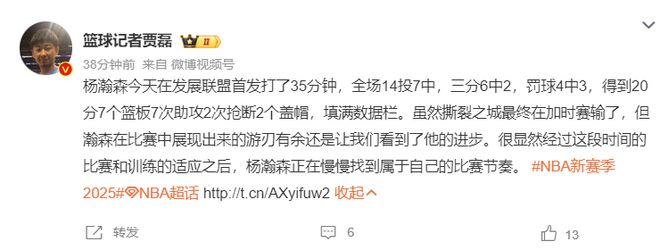 杨瀚森在G联赛又打出一场完美的球,全场比赛20+7+7,他直接登上了国内的热搜榜,作为现役中国男篮唯一一个在NBA打球的球员,中国球迷们都很关注他的表现。
